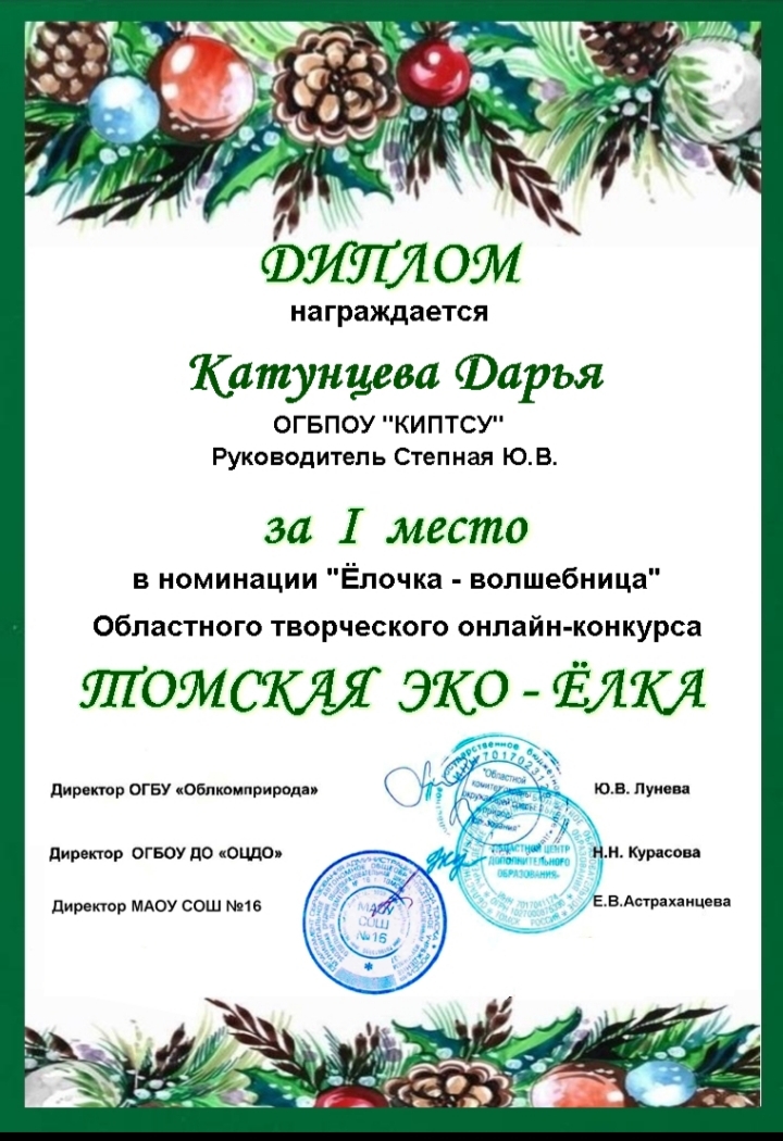 Лучшие авторские дизайнерские ели выставлялись на суд зрителей в виртуальной выставке. Елку из смешанных материалов-на конкурс в номинации «Елочка –Волшебница» - представила студентка нашего колледжа группы ДЗ-18 Катунцева Д. (Степная Ю.В.) и оказалось самой лучшей – ей вручен диплом за 1 место!